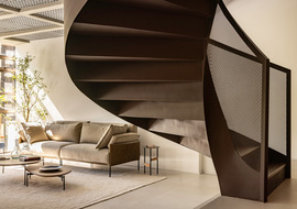 Na parte de pé direito mais baixo, camuflado atrás da porta de marcenaria, se encontra o escritório do casal, pensado para viabilizar as atividades de home office e também atuar como eventual quarto de hóspedes.